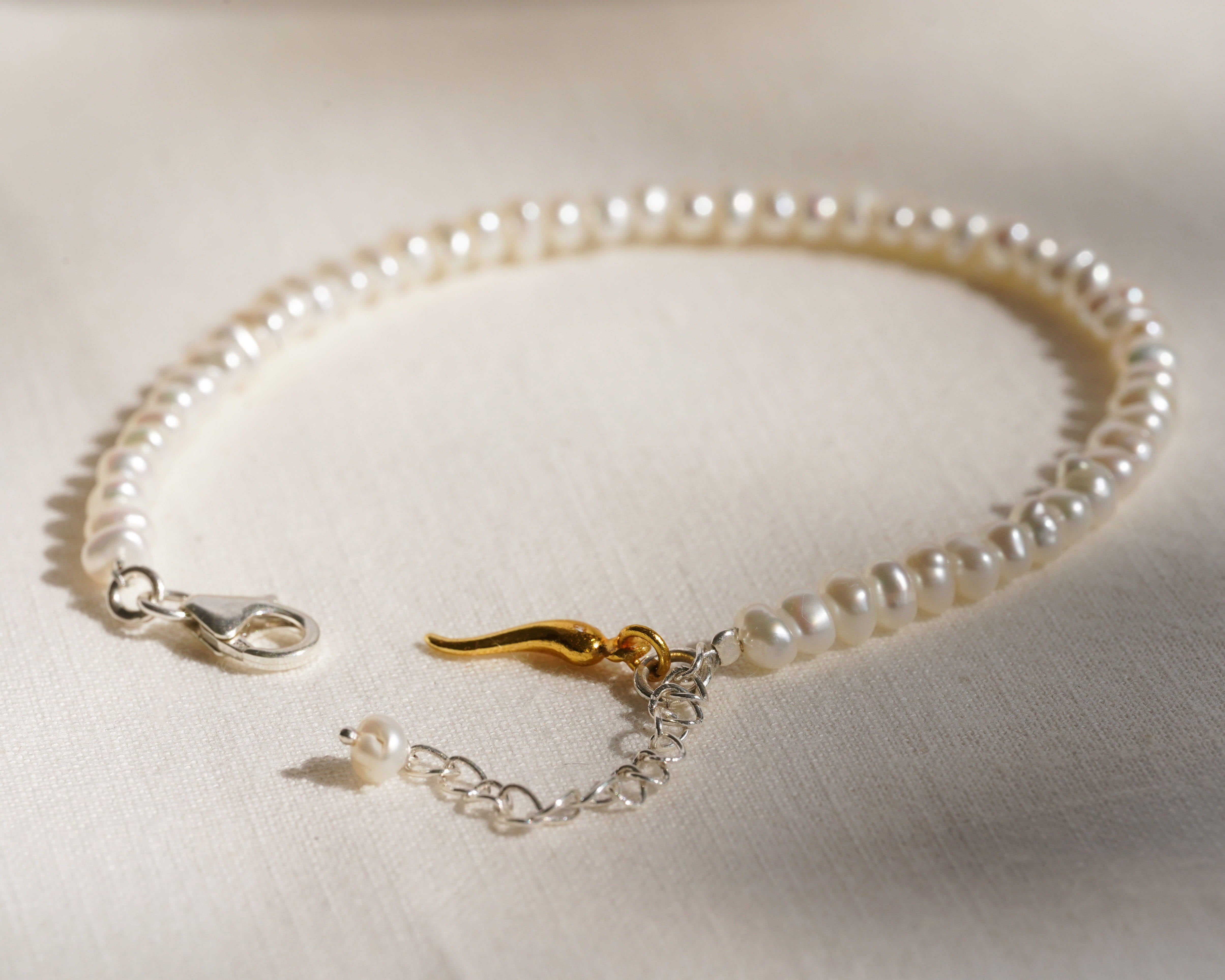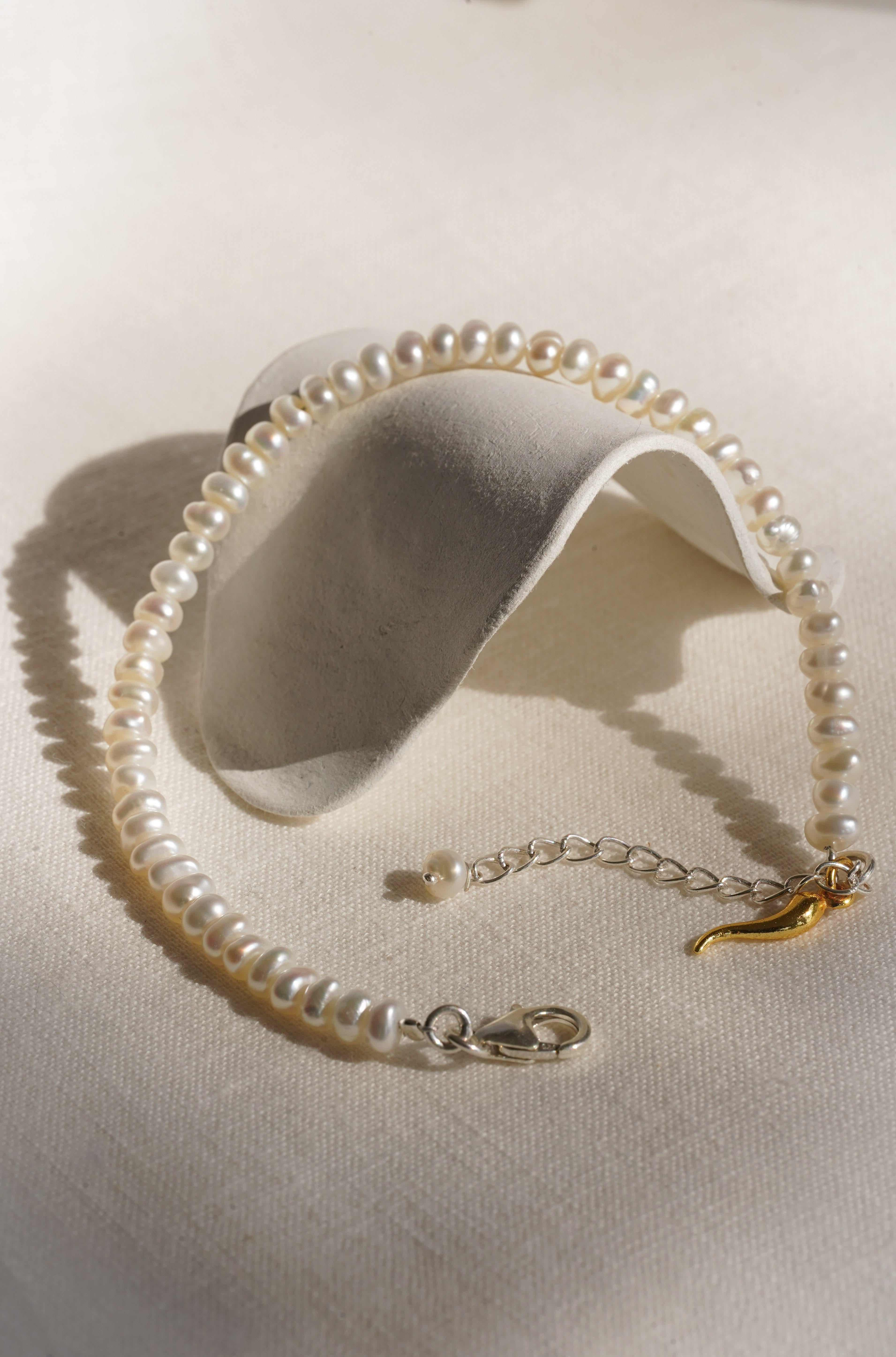 An instant classic. A string of natural Freshwater Pearls with an 18KT Gold plated chilli charm on the fastening.