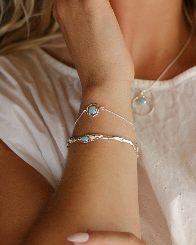 This dainty Sterling Silver bracelet features vibrant blue and white Opalites, a delicate flower detail and our signature 14kt gold fill wire and brass pip details.