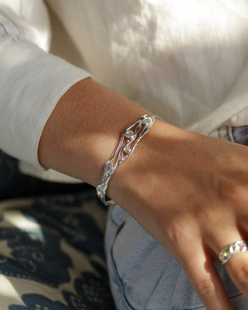 Iridescent multi-sized rainbow Moonstones are set on this organic Sterling Silver bangle, with 14KT Gold detailing and Brass pips.