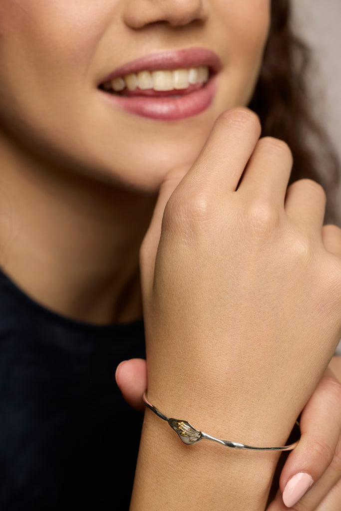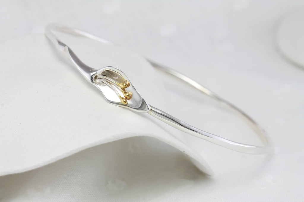 Handcrafted in Sterling Silver, this dainty bangle has touches of 18KT Gold. This elegant bangle features a subtle lily motif at its centre. Handmade as a seamless, slip-on bangle for effortless wear.