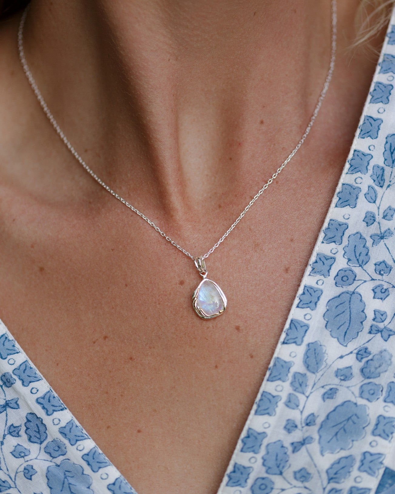 Organic Sterling Silver and 14KT Gold detailing surrounds a captivating, droplet shaped rainbow Moonstone.