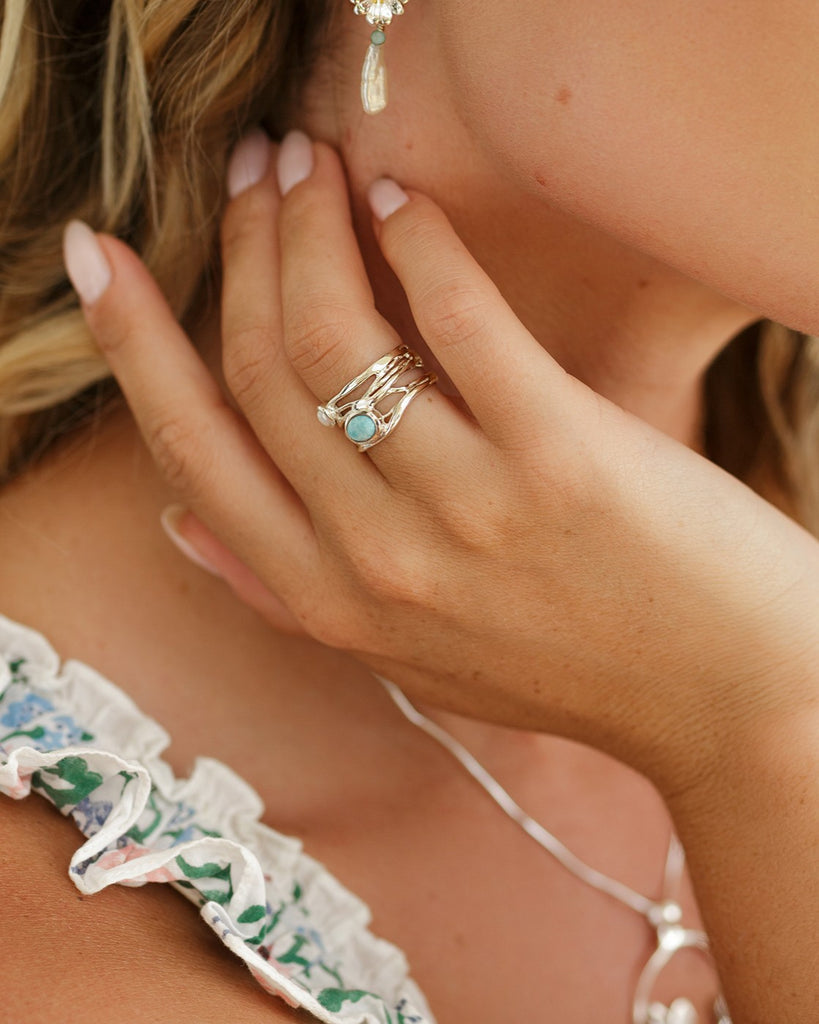 Designed in Banyan's signature flowing design, this statement Sterling Silver ring boasts two beautiful gemstones, an oval Larimar and round Freshwater Pearl.