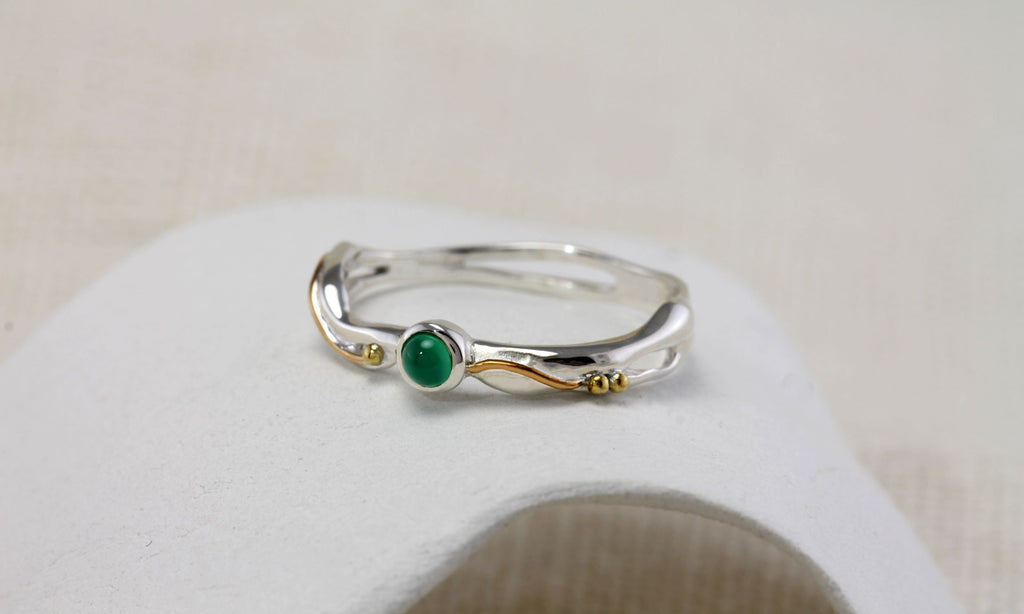 Handcrafted from sterling silver in an organic formation, this contemporary dainty ring is finished with a green onyx, 14kt gold fill wire and tiny brass pip details.