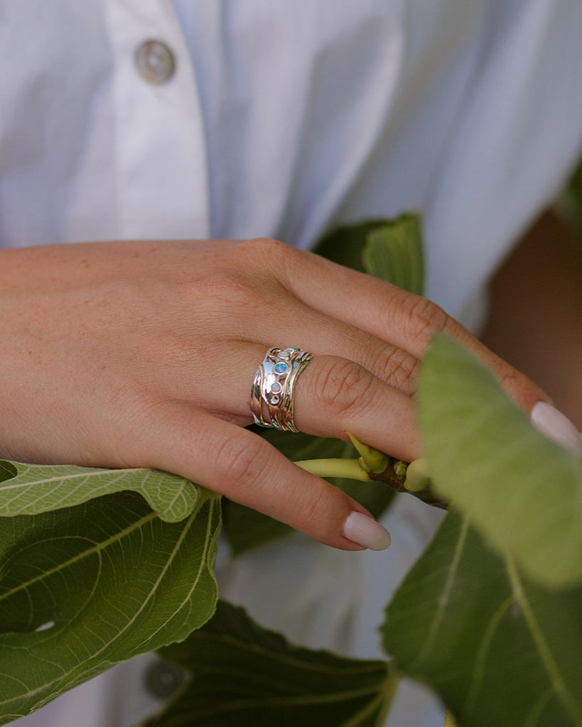 This statement ring showcases an array of vibrant blue and white fire Opalites. Handcrafted in a wave of Sterling Silver, it is finished with flowing 14KT Gold details.