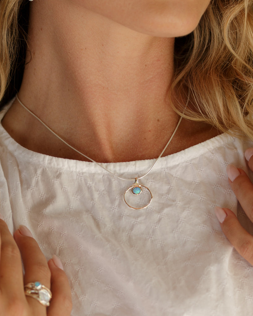 A pendant featuring a round, glinting blue Opalite with flecks of green encircled by a ring of silver.