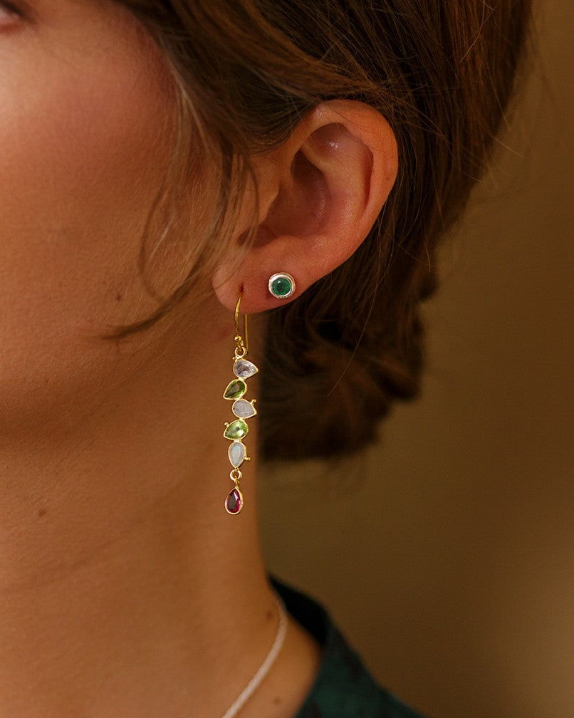 These delicate Gold Vermeil drop earrings feature Rainbow Moonstone, Green Peridot, Pink Tourmaline gemstones. These earrings are 6mm wide and have a 40mm drop, and come on open hook backs. Materials: Gold Vermeil, Rainbow Moonstone, Green Peridot, Pink Tourmaline