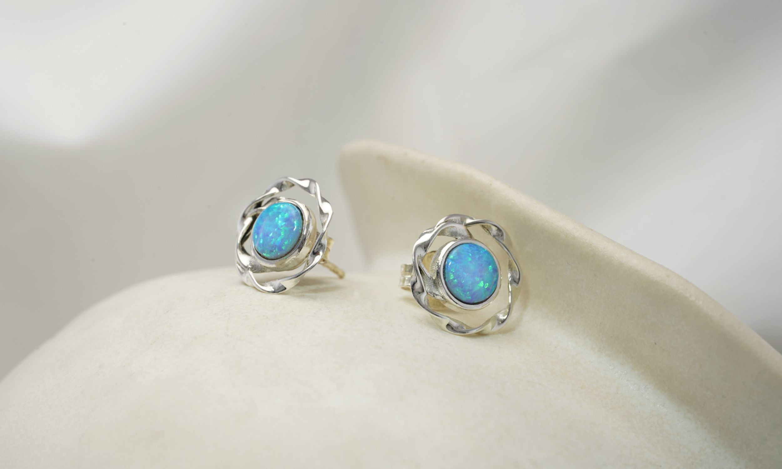 These sterling silver studs feature a twisted texture circling a blue Opalite.