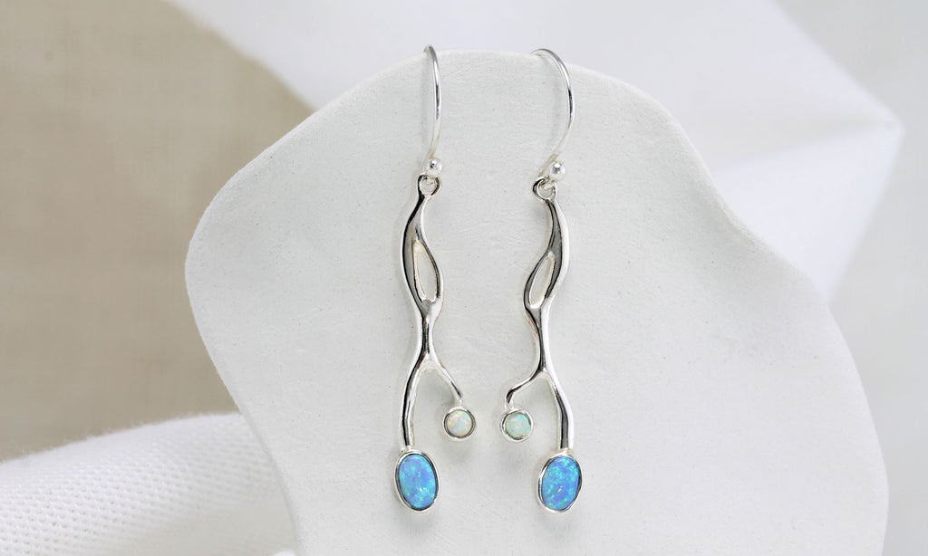A pair of handcrafted Sterling Silver earrings featuring striking Blue and White Opalite.