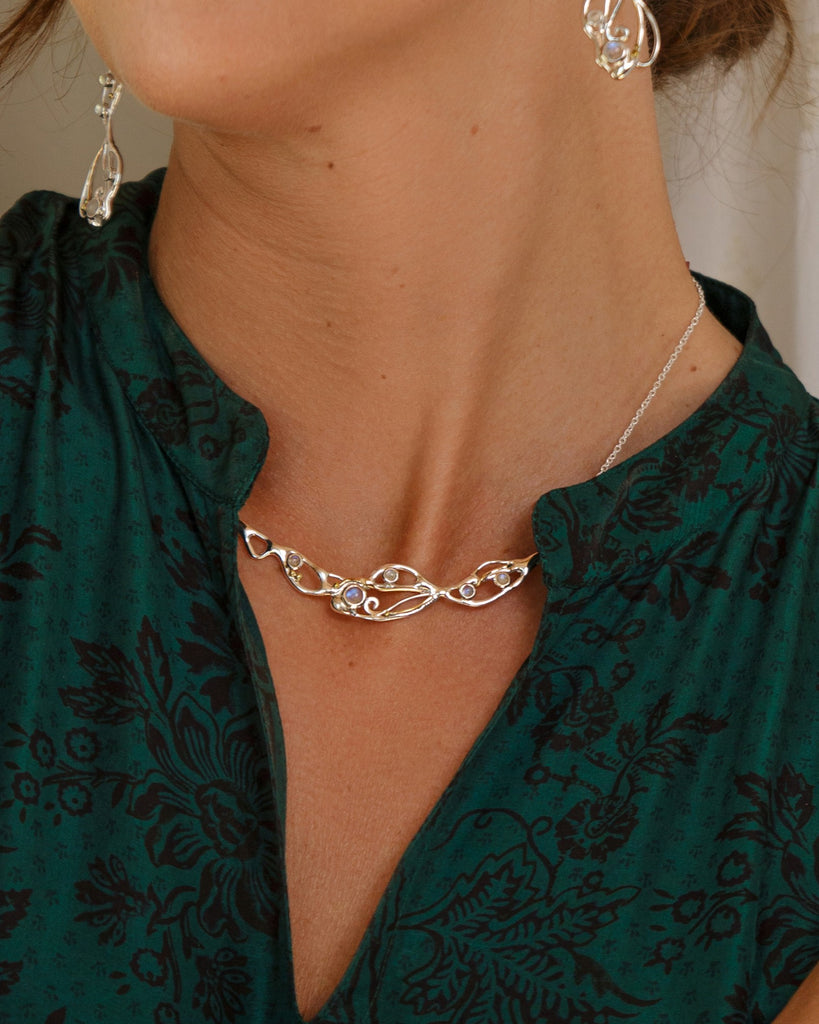 Handcrafted from Sterling Silver to form an organic flowing design that is set with cabochon rainbow Moonstones, and finished with our signature details of 14KT Gold and Brass pips.