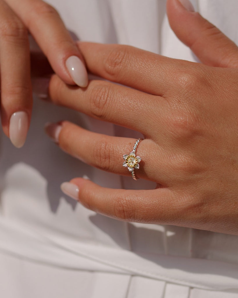 Expertly handcrafted with fine details, this Sterling Silver Daffodil Ring has spiralling details around the band and is finished with 18KT Gold plating.