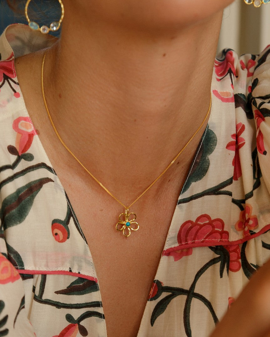 This dainty flower pendant is handcrafted from 18KT Gold Vermeil. It featured a small round Turquoise in it's centre, perfectly complementing the lightly hammered Gold. Matching earrings also available.