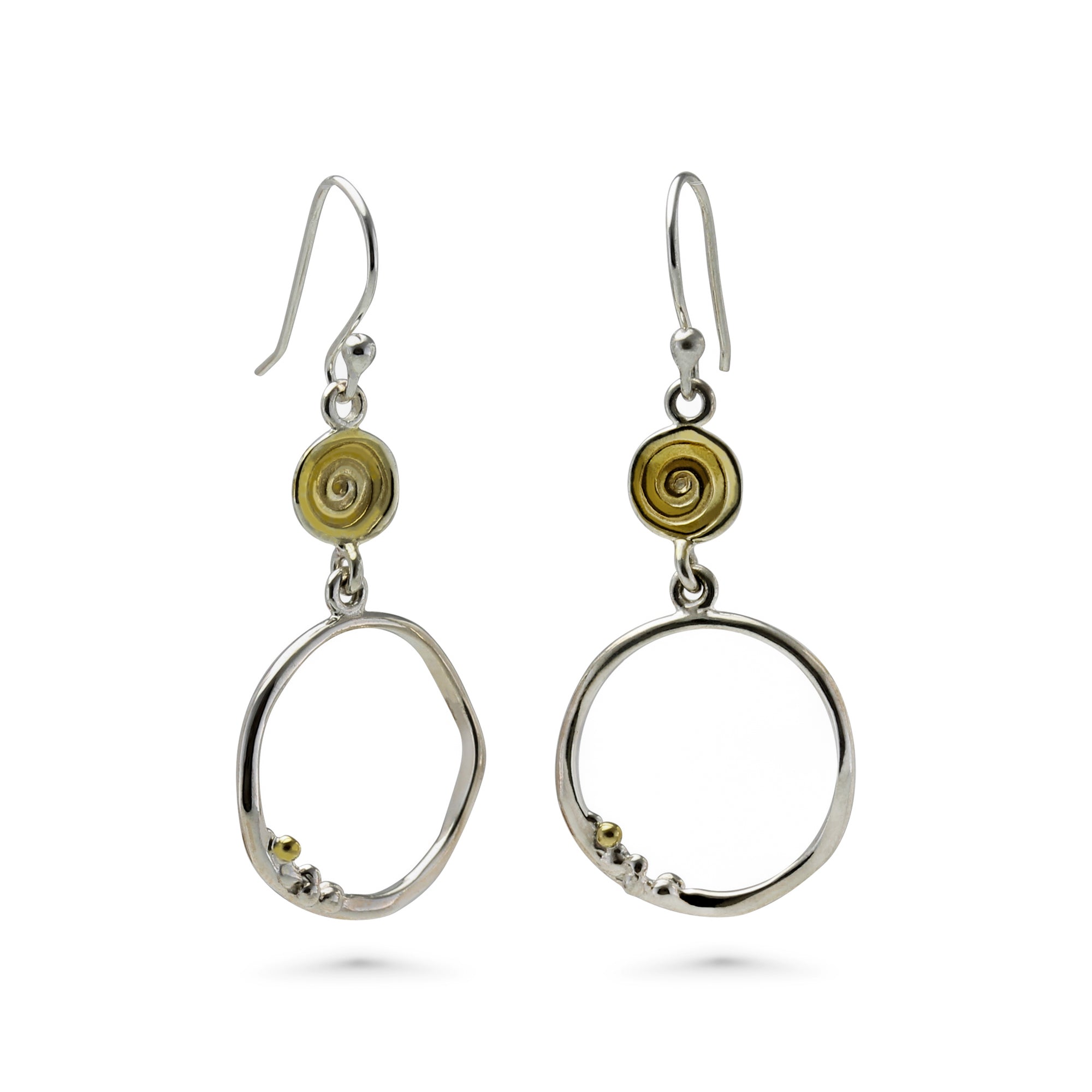 These unique hoop hook earrings are handcrafted in Sterling Silver. The main feature is the organically shaped circle which has dainty Silver details, accompanied by an 18KT Gold spiral.